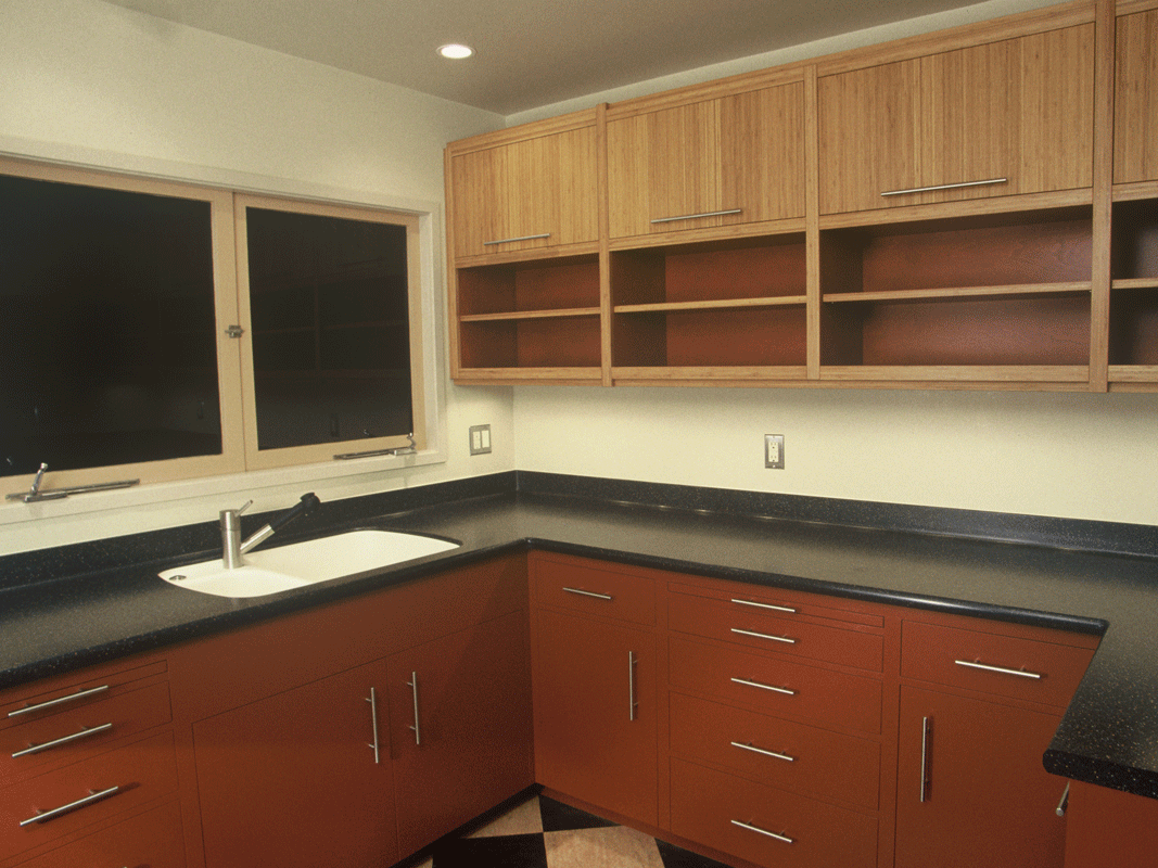 A complete kitchen remodel for a mid-century modern home in Berkeley CA, designed in close collaboration with the homeowner. Bamboo plywood used for doors, shelves and face-frame construction. Tasks included design consulation, demolition, rough and finished carpentry, cabinet construction and installation.