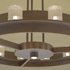 A chandelier constructed of solid and hollow-extruded brass. Finished in oil-rubbed bronze or polished nickel. Twelve halogen lamps are surrounded by antiqued, cast glass cylinders. A single halogen downlight provides local area lighting. One of a collection of interior lighting that includes chandeliers, a pendant lamp, various floor and table lamps and a wall sconce.